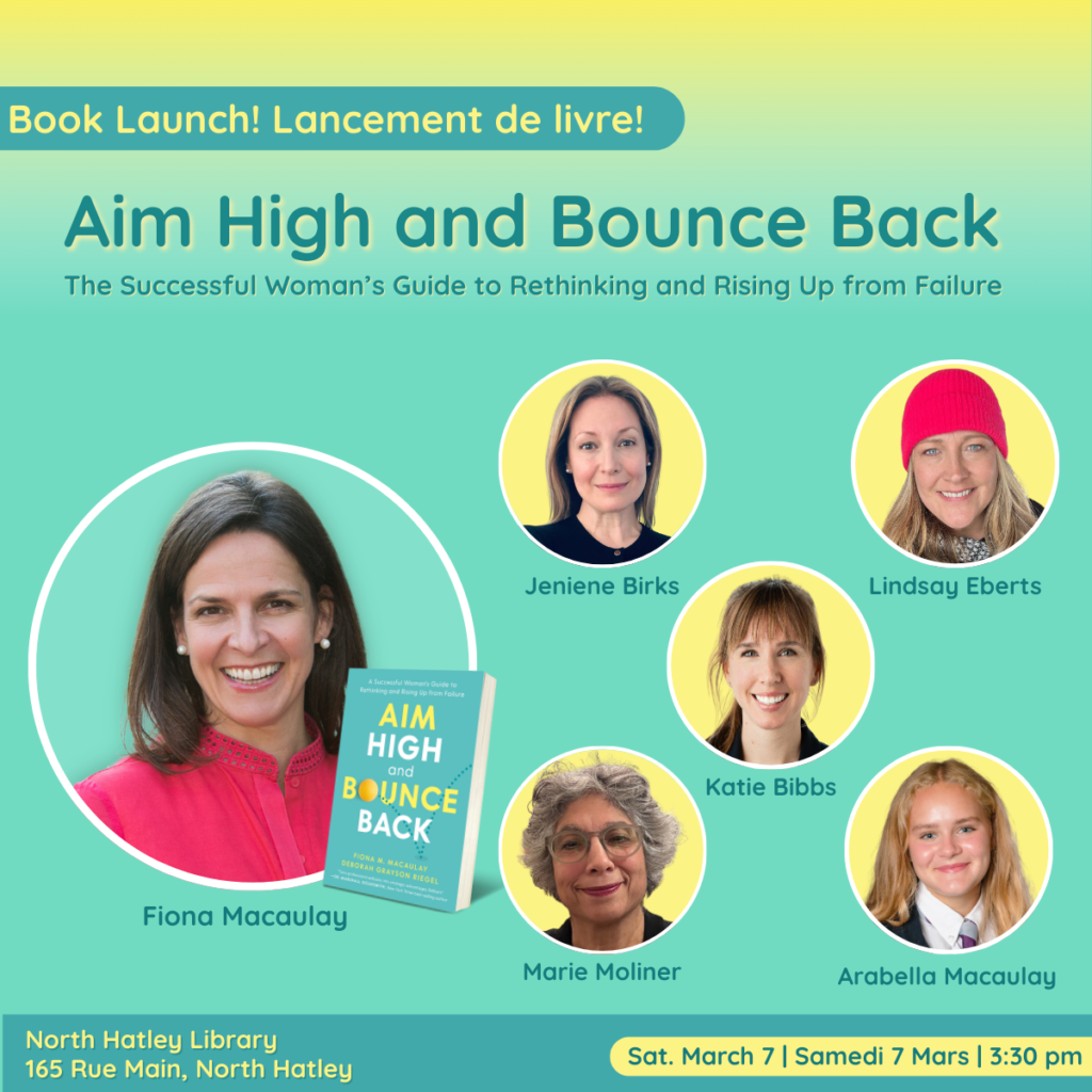 Joignez-vous à nous pour soligner le lancement de Aim High Bounce Back: A Successful Woman’s Guide to Rethinking and Rising Up from Failure, le nouveau livre de Fiona Macauley. Pour l’occasion, une table-ronde rassemblera 5 femmes en posture de leadership qui discuteront avec l’autrice d’ambition, de stratégies de recadrage et de résilience face aux échecs. Rafraichissements et séance d’autographes s’ensuivront. Tout le monde est bienvenu!